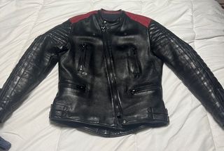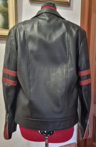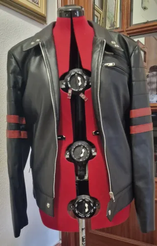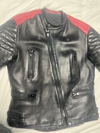 Chaqueta estilo biker para hombre, realizada con piel de vacuno en colores negro y rojo, hecha a mano, completamente nueva sin usar. Destaca la calidad de construcción tanto en su construcción como en la calidad de las cremalleras y puntadas. - Cierre de cremallera frontal. - Bolsillos con cremallera laterales y en la parte frontal derecha - Bolsillos interiores (2 en las solapas del forro y 1 más en piel) - Diferentes refuerzos interiores en piel (zona de las axilas)