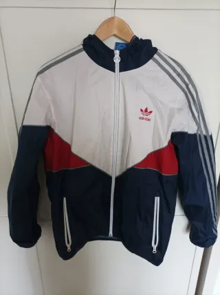 Chaqueta deportiva impermeable retro de Adidas con un diseño llamativo y moderno. - Paneles de color blanco, rojo y azul marino. - Tres rayas grises en las mangas. - Logo de Adidas en el pecho.