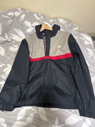 Chaqueta estilo anorak con un diseño moderno y llamativo. - Paneles de color beige, negro y rojo. - Logo de Kappa bordado en el pecho. - Cremallera parcial en la parte delantera. - Capucha integrada.