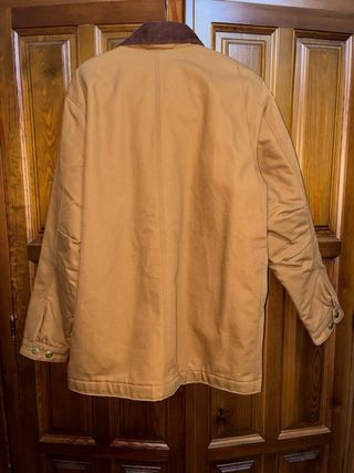 Chaqueta de trabajo clásica Carhartt. Nueva prácticamente. Puesta dos veces con la mala suerte de que me manché de tinta roja de un bolígrafo. Por lo demás está impecable. Tejido grueso de algodón de alta calidad. Color marrón clásico de Carhartt. - Cuello de pana. - Cierre de botones. - Bolsillos frontales. - Logo de la marca en el bolsillo.
