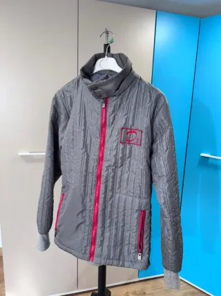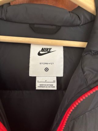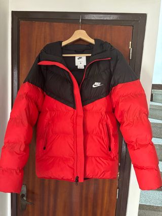Chaqueta acolchada de la marca Nike, con un diseño moderno y llamativo. Talla S muy poco uso - Combinación de colores negro y rojo. - Cierre frontal con cremallera. - Bolsillos laterales con cremallera.