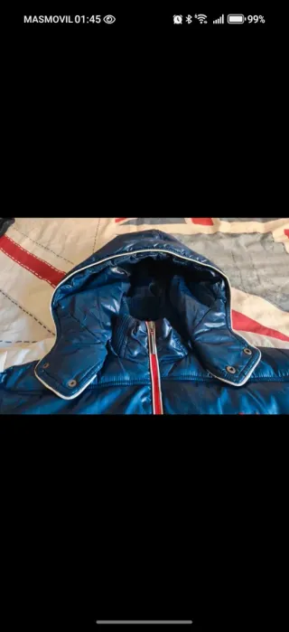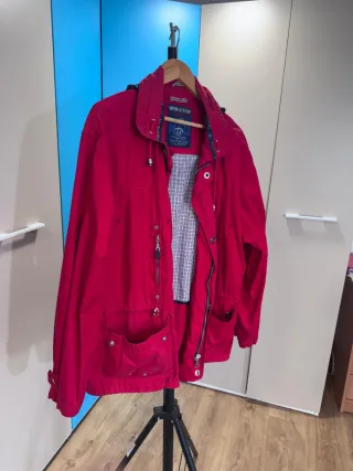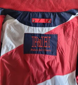 Chaqueta de la marca Pedro del Hierro en tonos azul marino y rojo con algun detalle en blanco.. Talla L. Cierre con cremallera y corchetes con el logo de la marca. 5 Bolsillos frontales ( 2 son dobles) y 3 bolsillos interiores. Cinturilla ajustable mediante goma interior. Tiene capucha plegable para la lluvia metida en cremallera posterior del cuello. Cremalleras y cuello con forro a contraste ( rojo). Nota: Tiene un pequeño cosido en el forro interior por un enganchón sufrido,pero tan apenas se aprecia(ver última foto) .Por lo demás,está como nueva ya que solo se ha usado en 3 o 4 ocasiones. Venta en persona o con envío