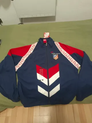 Chaqueta deportiva del Atlético de Madrid (nueva sin usar) - Diseño con detalles en rojo y blanco. - Logo del club bordado en el pecho. - Banda lateral con el nombre 'Atlético'.