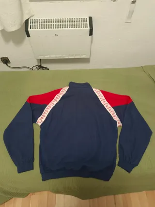 Chaqueta de estilo vintage roja y azul No se muy bien que talla es no esta en la etiqueta pero diría que es una L. Las dos ultimas fotos se ve mas dos marquitas que tiene por dentro amarillas Tiene cremallera y botones Gorro que se despliega por detrás Bolsillos Cintas elásticas por abajo