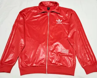 Chaqueta deportiva Adidas con un diseño retro. - Color principal rojo con detalles en negro y blanco. - Logo de Adidas en el pecho. - Cremallera frontal completa. - Bolsillos laterales con cremallera.