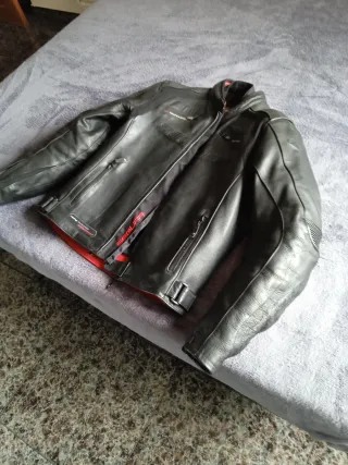 Chaqueta de cuero con un diseño único y llamativo. - Material: Cuero - Color: Rojo con detalles negros - Estilo: Motero con capucha - Cierre: Cremallera frontal y solapa - Detalles: Cremalleras decorativas y remaches. La vendo porque me equivoqué con la talla. Yo necesito una XXL y elegí una XXS. O sea que no me cabe ni un brazo. La empresa donde la he comprado no me dejan cambiarla porque dicen que ha sido fallo mío. Lo único que hacen es ofrecerme un descuento de un 20 %. La chaqueta está totalmente nueva, solo sacada de la bolsa.