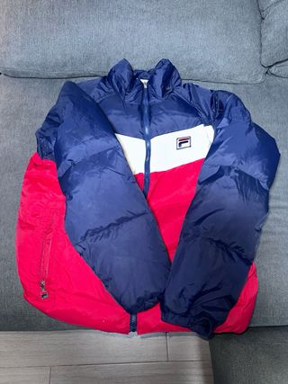 Chaqueta acolchada Fila original en perfecto estado, literalmente como nueva. Muy poco uso, sin manchas ni desgaste. Súper abrigada y ligera, con bolsillos con cremallera y cierre frontal. Diseño clásico en azul, blanco y rojo que queda brutal con cualquier outfit.