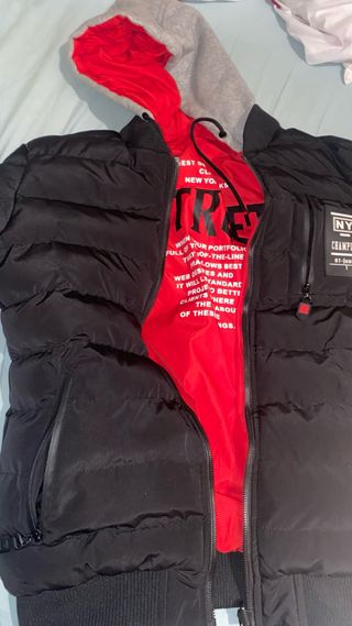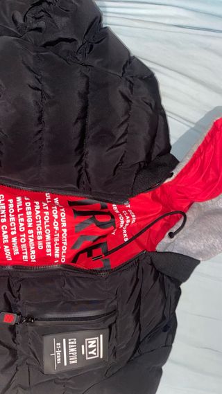 Chaqueta de invierno con un diseño moderno y llamativo. Perfecta para mantenerte abrigado con estilo. - Forro interior de color rojo vibrante. - Capucha integrada con forro gris. - Bolsillos laterales con cremallera. - Puños y cintura elásticos. - Detalle de parche con texto en la manga. Solo venta en persona