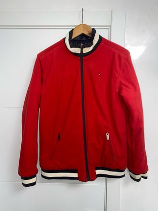 Chaqueta Tommy Hilfiger de color rojo. - Cierre de cremallera. - Bolsillos frontales con botón. - Cuello alto. -Talla S, yo mido 1.70 y peso 68kg y me esta perfecta. -Usada muy pocas veces