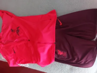 Conjunto deportivo de chándal del Liverpool FC. - Chaqueta deportiva roja con cremallera. - Pantalón deportivo morado. - Logos del Liverpool FC y Nike visibles. Con tecnología Dri fit que absorbe el sudor Talla 158_17 El pantalón hacia la rodilla tiene un roce.de hay el precio , se ve en la foto 6