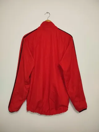 Chaqueta deportiva Adidas en talla M, con detalles en rojo y azul. Viene con sus etiquetas originales. - Cierre completo con cremallera. - Cuello alto. - Puños y bajo elásticos. - Tres rayas características en las mangas. - Logo de Adidas en el pecho.
