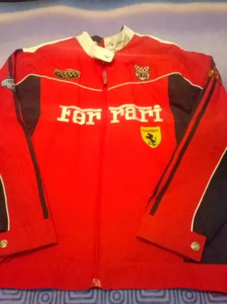 Cazadora o chaqueta deportiva con diseño inspirado en Ferrari. - Color principal rojo con detalles en negro. - Cuello alto con cierre de botón. - Cremallera frontal. - Logos distintivos de Ferrari y escudería.