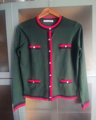 Como nueva, muy suave, un sólo uso. Mide de sisa a sisa 45 cm y de largo desde el hombro 56 cm. Color verde oscuro con los filos y adornos en azul marino y rojo. Botones dorados.