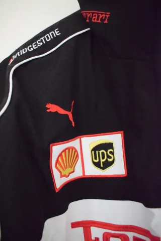 Chaqueta deportiva con diseño inspirado en la escudería Ferrari. - Paneles en color negro, blanco y rojo. - Logos de Ferrari y patrocinadores. - Cuello alto y cierre de cremallera.