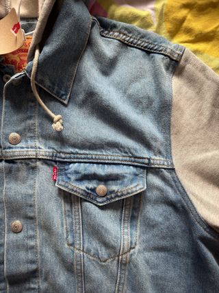 Chaqueta trucker Levi's con diseño híbrido, combinando denim y tejido de sudadera. - Mangas y capucha de tejido suave. - Cierre de botones metálicos. - Bolsillos frontales con botón. - Detalle de etiqueta roja característica de la marca.