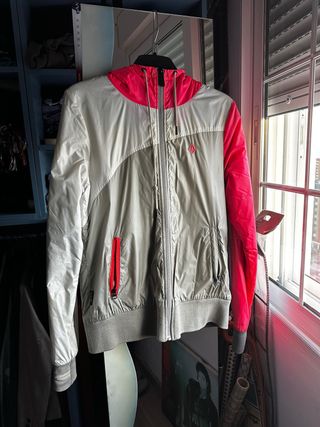 Chaqueta deportiva chubasquera con capucha. Está en perfecto estado, no se ha usado. Es totalmente original de la marca Jordan. La cremallera funciona perfectamente. - Diseño bicolor en rojo y negro. - Cierre de cremallera frontal. -Capucha con cordón ajustable