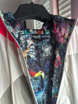 Cazadora de estilo deportivo con un diseño llamativo en rojo, blanco y negro. - Combinación de materiales. - Cuello redondo. - Cierre de cremallera frontal. - Puños y bajo elásticos. - Largo 62, pecho 60 y hombros 58.
