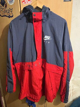 Chaqueta cortavientos de la marca Nike, modelo Air. - Diseño bicolor en gris y rojo. - Capucha integrada. - Bolsillo frontal con cremallera.
