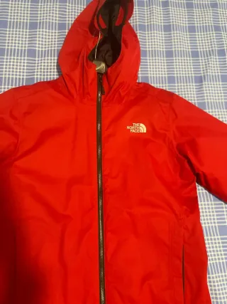 Chaqueta Decathlon con capucha desmontable y forro interior. Impermeable y muy calentito. Ideal para la nieve. Está bastante usado pero no tiene nada roto, es más bien el color lo que le hace más usado. Es un buen abrigo. Es unisex, vale para hombre y para mujer. Talla M. - Capucha de color rojo. - Forro interior de color gris muy calentito. - Bolsillos con cremalleras - Cordones ajustables en la muñeca.