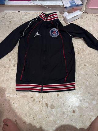 Conjunto deportivo de chándal. - Chaqueta con cremallera completa. - Pantalón con cintura elástica y cordón. - Logos de Paris Saint-Germain y Jordan. - Detalles de rayas rojas y blancas.