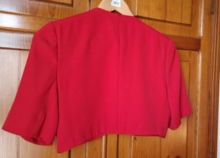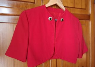 Bolero o chaquetilla corta de color rojo, ideal para complementar un atuendo. De diseño abierto Forrado por dentro. No lleva talla y corresponde a una 36-38. Ancho de hombros 38 cm y largo desde el hombro 38 cm tambien.Muy buen tejido, de crep.