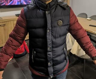 Chaqueta acolchada con mangas de diferente color. - Diseño con chaleco azul marino y mangas en color burdeos. - Cierre de cremallera y botones. - Bolsillos laterales con cremallera.