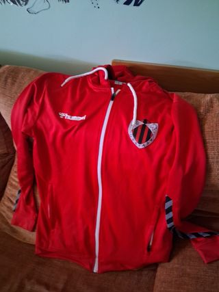 Chaqueta deportiva de color rojo con detalles en las mangas. Dos a precio de una - Logo de Hummel en el pecho. - Escudo del equipo en el pecho. - Cremallera frontal. - Bolsillos laterales. Entrega presencial, Huelva