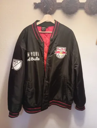 Chaqueta estilo bomber de los New York Red Bulls. - Diseño en color negro con detalles en rojo. - Logo de la MLS en la manga izquierda. - Escudo del equipo New York Red Bulls en el pecho derecho. - Interior acolchado en color rojo. Está como nueva, muy poco uso.