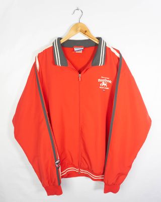 Chaqueta fina con un diseño moderno y llamativo. - Diseño en color rojo y blanco. - Cremallera frontal. - Bolsillo con cremallera en la manga.