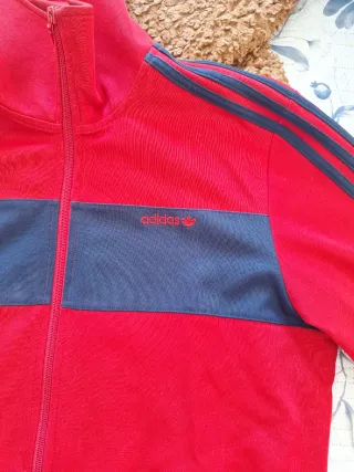 Chaqueta deportiva Adidas con un diseño clásico y llamativo. - Color principal rojo vibrante. - Banda horizontal azul en el pecho. - Tres franjas icónicas de Adidas en las mangas. - Logo de Adidas en el pecho.