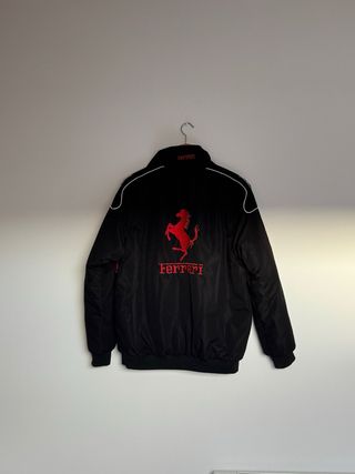 Chaqueta de estilo vintage de Ferrari, con un diseño llamativo en negro y rojo. Talla L - Logo de Ferrari bordado en el pecho. - Detalles de patrocinadores en las mangas y el pecho. - Cuello alto y puños elásticos.