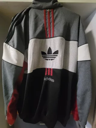 Chaqueta deportiva Adidas con un diseño vintage y llamativo. - Cremallera completa. - Mangas con detalles de rayas. - Paneles de color en contraste. La sudadera tiene uso, pero está en perfecto estado. Nada roto, ni rozado ni ninguna mancha. No tiene desperfectos.