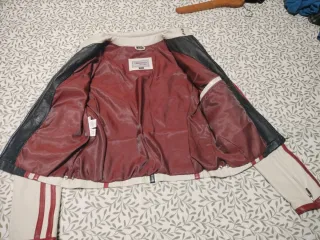 Chaqueta de cuero estilo vintage, con un diseño bicolor. - Paneles en color rojo y negro. - Detalles de bandas blancas en mangas y hombros. - Cierre frontal con cremallera. - Bolsillos con cremallera. - Parches decorativos de honda, porsche y harley. - Cuello redondo con cierre de botón. Tiene uso pero esta en perfectas condiciones solo hace falta hidratar el cuero.