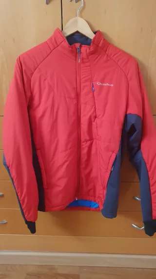 Chaqueta deportiva Quechua. - Diseño en color rojo con detalles en azul. - Cremallera frontal. - Mangas elásticas. - Cuello alto cortito. Ideal como segunda capa para la práctica de deportes de montaña. Alpinismo Escalada