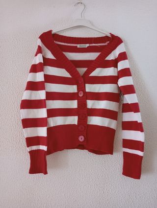 Preciosa chaqueta de punto de la marca Blanco. Es de color rojo y blanco a rayas, y tiene una talla 40. Está en muy buen estado. - Cierre de botones. - Manga larga. - Diseño a rayas.