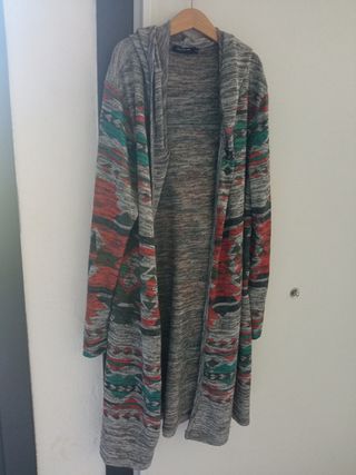 Preciosa chaqueta larga de punto, perfecta para entretiempo. Tiene capucha y un diseño étnico en tonos grises, rojos y verdes. Es suave y cómoda de llevar. - Diseño étnico - Capucha - Manga larga - Tejido suave