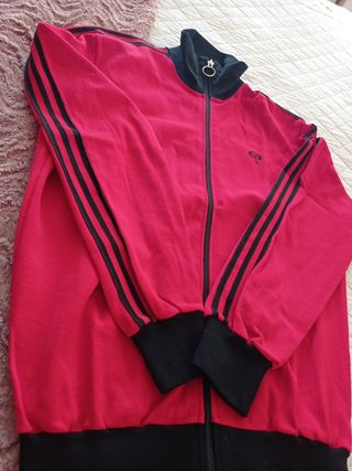 Chaqueta Adidas de color rojo. - Cremallera completa - Tres bandas negras en las mangas - Logo Adidas: algo desgastado (ver foto)