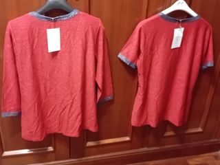 Conjunto de dos prendas de vestir, una chaqueta y una camiseta, ambas en un llamativo color rojo con detalles. - Chaqueta de punto fino con botones. - Camiseta de manga corta. - Ambas prendas con ribete en contraste.