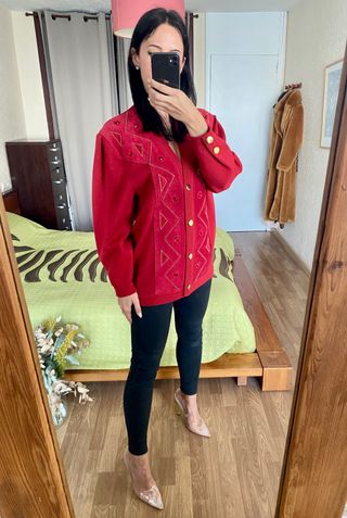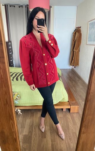 #cardigans_anabrotons #size_l_anabrotons #torras_anabrotons 🧶 chaqueta roja estilo cárdigan 100% lana virgen de la firma española Torras, talla 46 equivalente a talla L, en color rojo con detalles de strass en dorado. 🧶 es una prenda vintage, de calidad excepcional. 🧶 piel natural central, cierre central con botones dorados. Escote en pico, manga amplia, botones dorados en mangas 🧶 Medidas: 51 cm de cintura, 52 cm de sisa, 73 cm de largo, 44 cm de hombros 🧶 sirve para tallas inferiores para un estilo Oversize 🧶 precio en boutique 639 €, muy poco uso, pequeña mancha detallada en la última foto