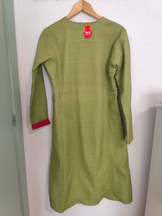 Preciosa chaqueta larga/abrigo de entretiempo, efecto seda, en color verde lima. Es una prenda única y elegante, para boda o comunión , ideal para la primavera u otoño. - Diseño cruzado con cinturón. - Cordones para atar por delante con bolitas metálicas y de cerámica. - Manga larga. - Tejido suave y ligero. - Detalles en rojo en el interior del cuello y los puños.