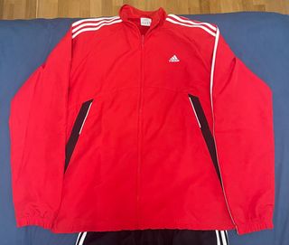 Conjunto deportivo Adidas de dos piezas. - Chaqueta de color rojo con detalles en negro y las icónicas tres rayas blancas en las mangas. - Pantalón largo de color negro con las tres rayas blancas a los lados.