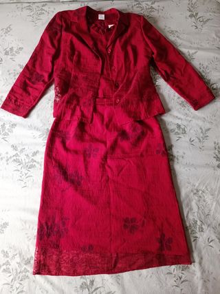 Vintage. Usado en una única ocasión para un evento. Comprado en el corte inglés. Estado totalmente nuevo e impecable. La falda tiene forro interior. Color rojo cereza precioso. Envío con su percha- colgador. Medidas: Chaqueta: hombro a hombro 45cm, largo manga desde hombro 59cm, contorno pecho 102cm, contorno cintura 94 cm, contorno cadera 110cm. Top: hombro a hombro 44 cm, contorno pecho 100 cm, contorno cintura 90 cm, largo 51 cm. Falda: contorno cadera 109 cm, contorno cintura 78 cm, largo 77cm. Ideal para ceremonias y eventos.