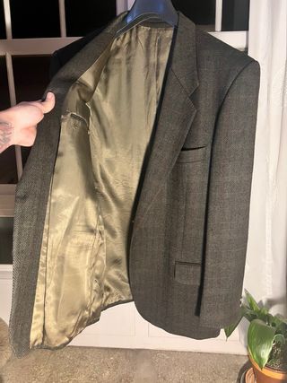 Americana de lana pura, talla 50, de muy buena calidad, ya no las fabrican así. Tiene hombreras. Color verde oscuro con cuadros verde oliva y línea roja. Medidas: -Hombros 49 -Manga 63/64 -Largo 75 -Espalda 58