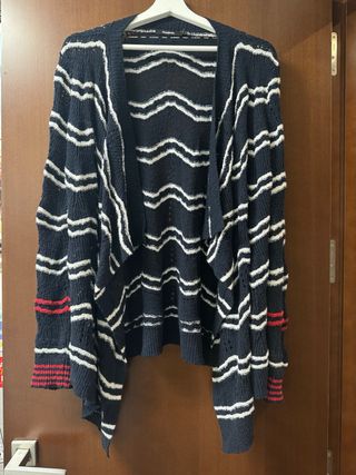 Preciosa chaqueta de punto de la marca Desigual. Es de color blanco, azul y rojo, con un diseño de rayas onduladas. Tiene un corte amplio y un estilo informal. - Tejido ligero y suave. - Manga larga. - Bajo asimétrico.