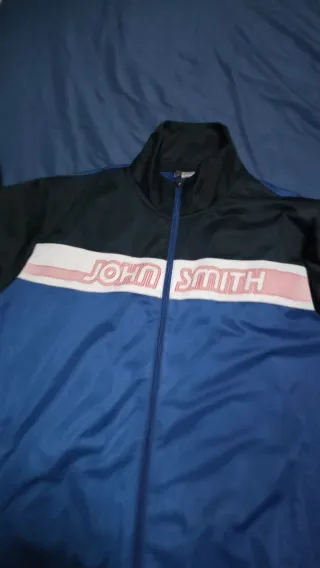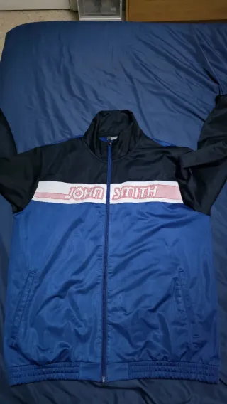 Chaqueta deportiva con un diseño llamativo y detalles de rayas rojas. - Diseño con el número 3 en rojo en el pecho. - Mangas con rayas rojas y azul marino. - Cremallera frontal. - Puños y cintura de canalé. - Pequeña marca azul en la parte trasera. Ver foto.