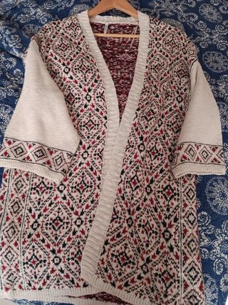 Preciosa chaqueta de punto de Stradivarius, talla S. Es una prenda elegante y cómoda, ideal para entretiempo. - Diseño de punto con estampado geométrico en tonos beige y rojo. - Manga tres cuartos. - Corte amplio y favorecedor.