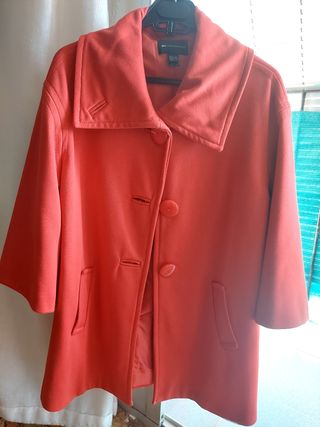 Chaqueta roja, larga y entallada. Buen estado, con signos de desgaste en el interior de mangas y cuello. Temporada: primavera/otoño. Marca: Desigual. Talla: 36.