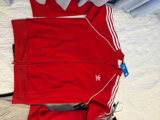 Chaqueta deportiva Adidas de color rojo. Está en muy buen estado. - Cremallera frontal - Tres bandas blancas en las mangas - Logo Adidas en el pecho -Y por 30€ más te llevas el pantalón a conjunto