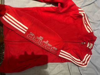 Chaqueta deportiva Adidas para niñ@, ideal para entrenar o usar a diario. Está en muy buen estado. - Color rojo con detalles en blanco y negro. - Cremallera frontal. - Tres rayas características de Adidas en las mangas. -Talla 13-14 años