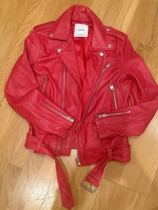 Chaqueta estilo biker confeccionada en piel roja. - Diseño clásico de biker. - Cierre frontal con cremallera. - Bolsillos con cremallera. - Cinturón ajustable en la cintura.